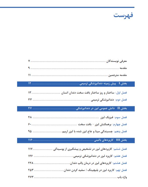 قریب بیست و اندی سال است که لیزر جای خود را در عرصه دندانپزشکی باز کرده است. این طی طریق بطور آهسته و پیوسته به همت دانشمندان و دندانپزشکان علاقمند و پیشرو انجام گرفته است. این کتاب نتیجه تحقیقات و تجارب کلینیکی و لابراتوری اساتید این رشته آقایان "جیووانی و ماتئو اُلیوی" در زمینه کاربردی لیزر در دندانپزشکی ترمیمی میباشد. این موارد شامل عملکرد لیزرهای مختلف از جمله دیود و اِربیوم بر روی نسوج نرم و سخت دندانی است. هدف از ترجمه این کتاب، آشنایی دندانپزشکان با علوم پایهای لیزر، تأثیر آن برروی نسوج دندانی و خصوصاً کاربرد آنها در دندانپزشکی ترمیمی میباشد.